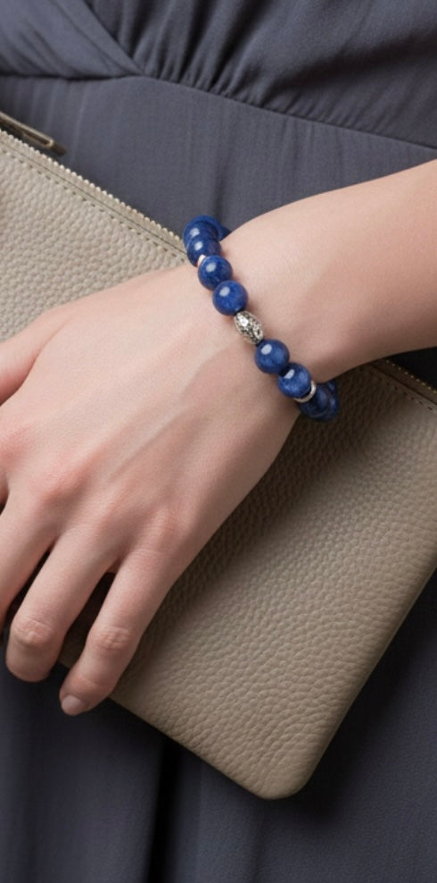 Blue Kyanite Bracelet with Decorative Silver Charms, Semiprecious Stone Jewelry