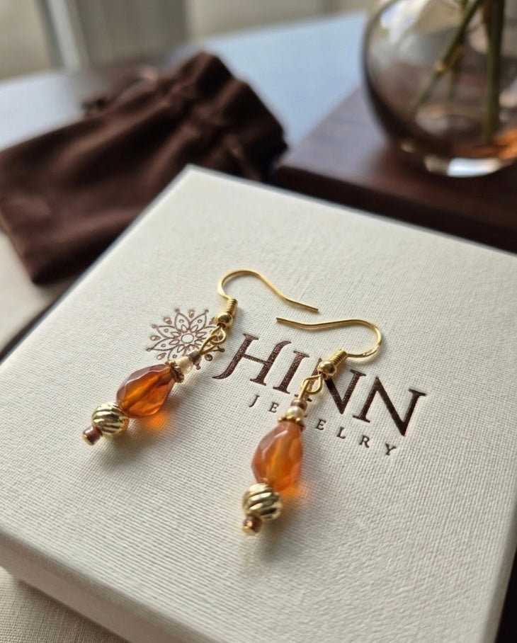 Faced Carnelian Teardrop Natural Gemstone with Decorative 18K Gold Bead Drop Earrings