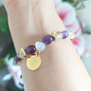 Amethyst and Citrine Bracelet with Decorative 18K Gold Rhodium Plated Charm, Semiprecious Stone Jewelry