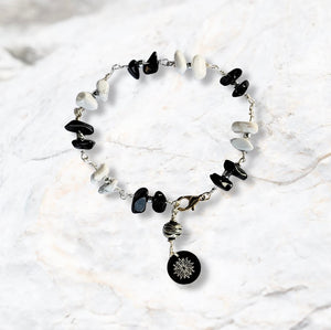 Onyx and Howlite Stone Wire Bracelet with Decorative Silver Charm and Lobster Clasp, Semiprecious Stone Jewelry
